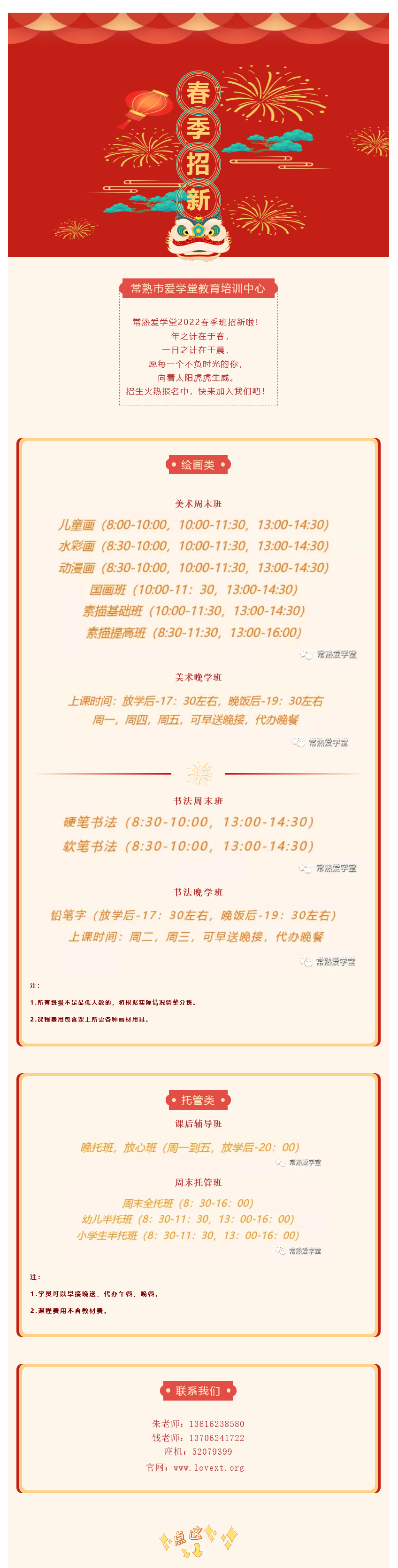 【特邀专业教师】徐韩年老师,张老师,范老师,金老师,王老师,朱老师,顾老师,邵老师,钱老师,徐老师,吴老师,马老师,郭老师,黄老师等加入,一起开设课程:国画,书法,铅笔字,钢笔字,儿童画,水彩画,创意美术,彩铅画,素描陶泥手工班,朱老师艺术教室,黄老师功夫小瓷陶艺教室,马老师围棋教室,郭老师吉他教室,精品全托班